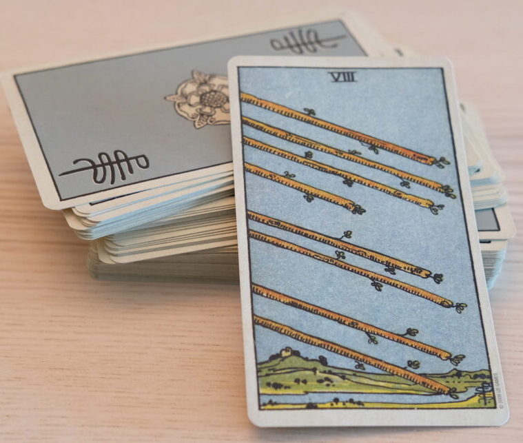 Yet, Pluto in Aquarius, alongside these Gemini transits, tells you that the next few years utterly depends on the community if you are to see your ideas work. Look at this card, draw another and ask yourself what the pros and cons are. This is the Eight of Wands. Do you all fall in a heap or do you pull off a spectacular R.A.F. formation and land in a creative, inspiring new pyramid together?
