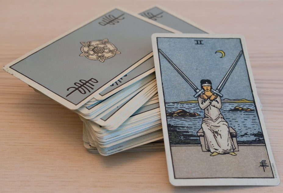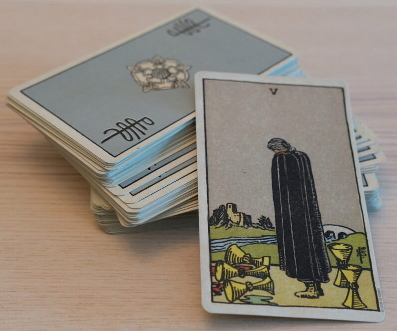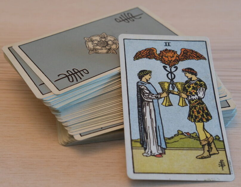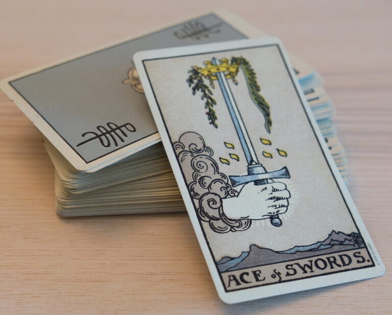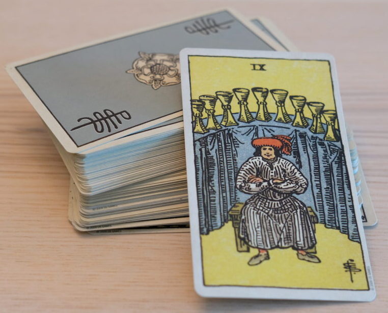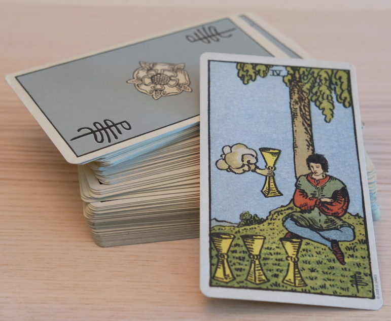 There are many symbols here. Perhaps they have personal meaning for you. The letter W is on the cup. The Christian cross is on the Holy Communion wafer. The dove of peace flies overhead. The Tibetan Buddhist lotus flowers float on the water. The cup itself is about emotional or sometimes sexual fulfilment, and this one is overflowing as we’ve seen. There is no end to what pours forth. Your cup runneth over and the cups were associated with water signs in the original Tarot, so this is Cancer, Scorpio, Pisces.