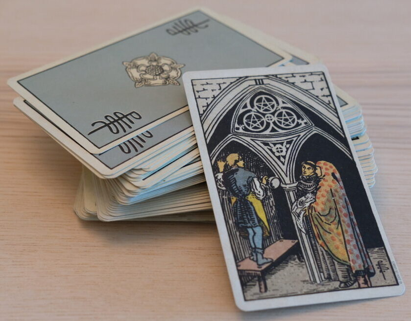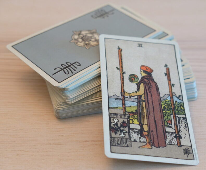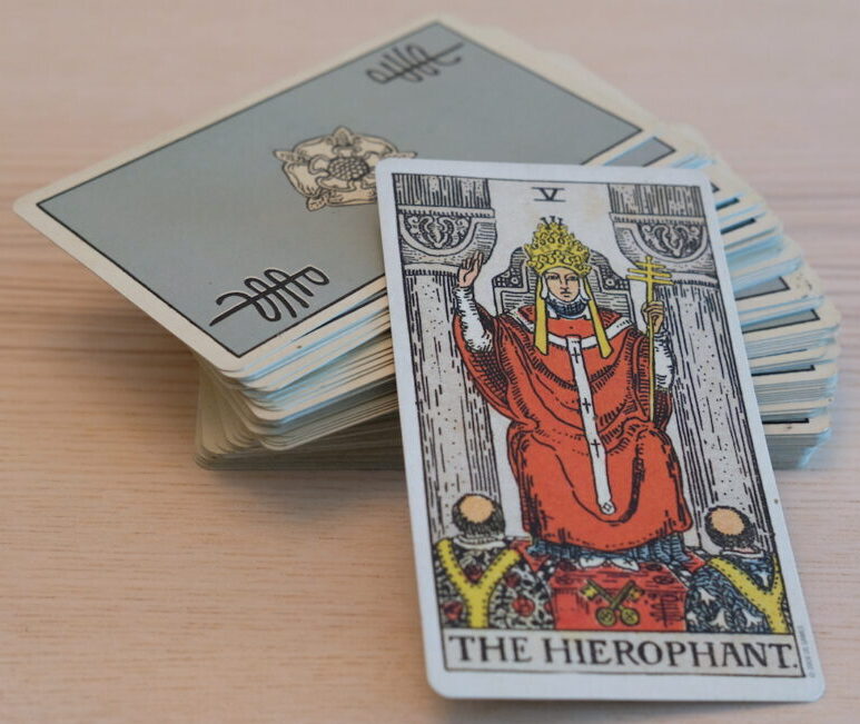 The ‘bible’ or ‘good book’ is prominent here. The word is the law. The monks suggest questions about accepting or rejecting that. Perhaps this Tarot card has a personal message for you, Aries. You may be a Catholic. Perhaps this is the Pope laying down the law about celibacy, and perhaps about the holy vows of matrimony.