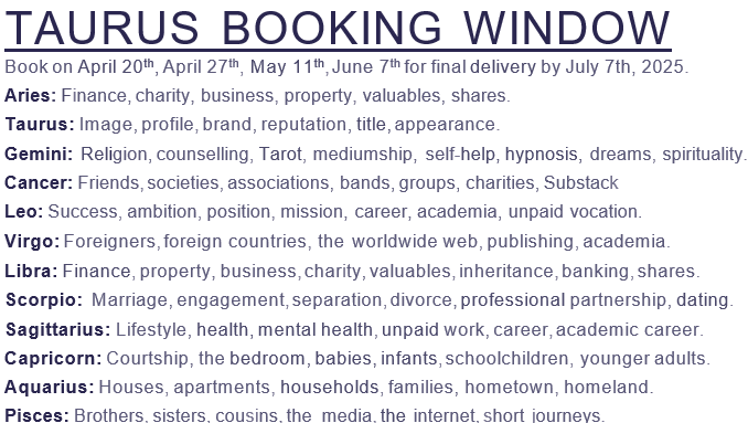 You can book Astrology Delivery for the new Taurus weather season next. If you’re a Premium Member, you’ll already have the calendar which gives you all the booking windows for the year.