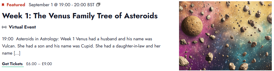 Come along on Monday, September 1st, 2025, at 7:00 pm London Time to a Zoom about love, sex, relationships and marriage shown in your personal birth chart. What does the Venus family of asteroids tell you? Hosted by The Astrological Lodge of London. Recording included with your £9 ticket – around AUD $19 or USD $12. Sign up here.
