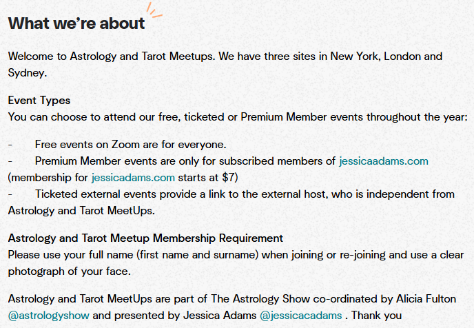 Astrology and Tarot on Zoom is available for you from our Australia, London and New York groups. I hold multiple events across these meetups throughout the year. It’s free to join: