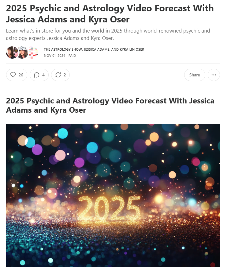 The Astrology Show on Substack has a free audio podcast, every week, covering your horoscope and Tarot. There is also a paid version of the show, with two videos every month. Included now is your 2025 forecast with acclaimed psychic Kyra Oser. Do join us. Sun Sign School tutors Tara Buffington, Katie-Ellen Hazeldine and Stephanie Johnson are on Substack too. I love it there.