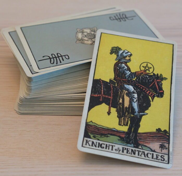 Capricorn – The Queen of Pentacles is one of many figures in Pamela and Arthur’s Tarot who is pondering money. Lost in daydreams. Basking in the moment, which is financially secure. Yet – this needs to be invested or put to good use. Something has to be done with this money; one cannot sit gazing at it forever. And, of course, you cannot handle the cash and the rabbit at the same time. You will have to put the money in a safe place, or spend it, or donate it – so you can be liberated enough to catch the rabbit before it hops away.